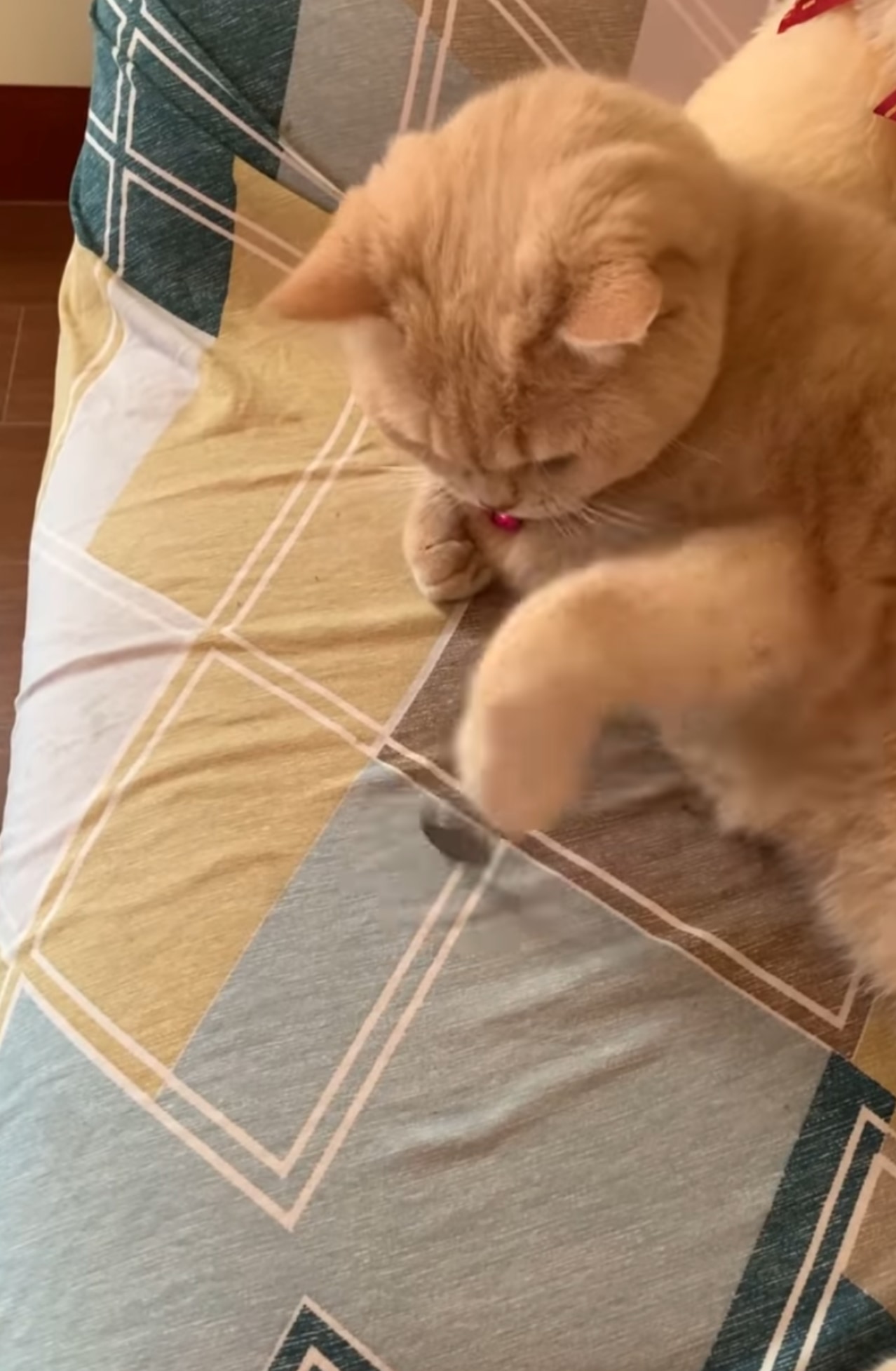 海外のとある家庭で撮影された動画の冒頭には、飼い主さんがニャンコの目の前でちょっとしたトリックを披露する様子が映っています。そのトリックというのがこちら。