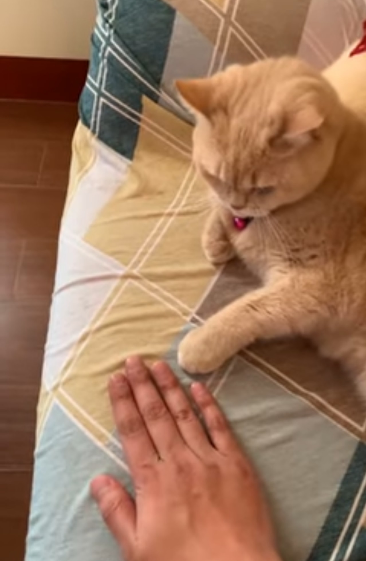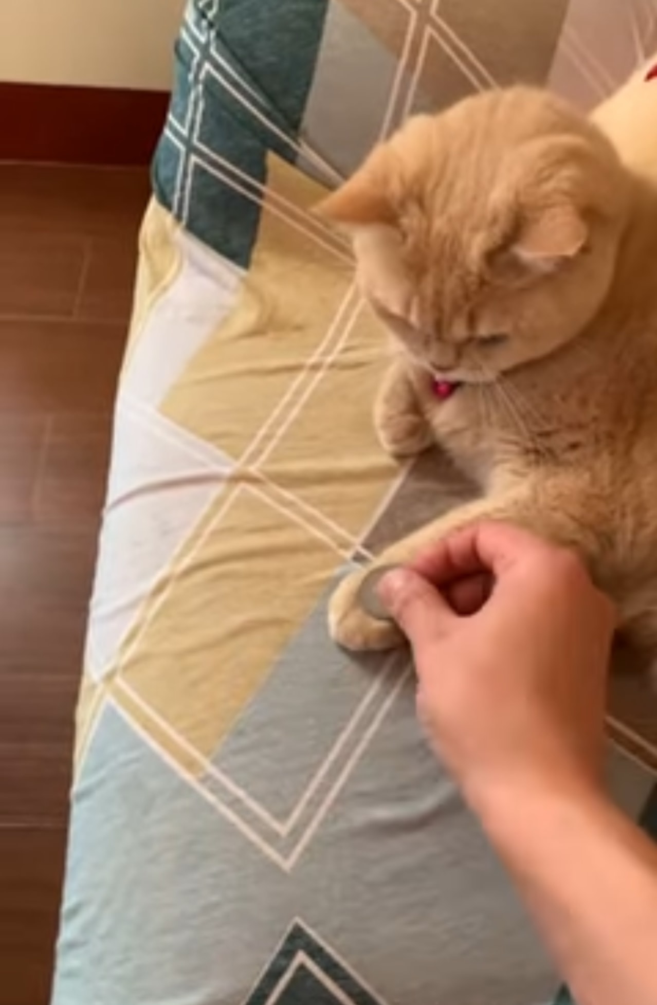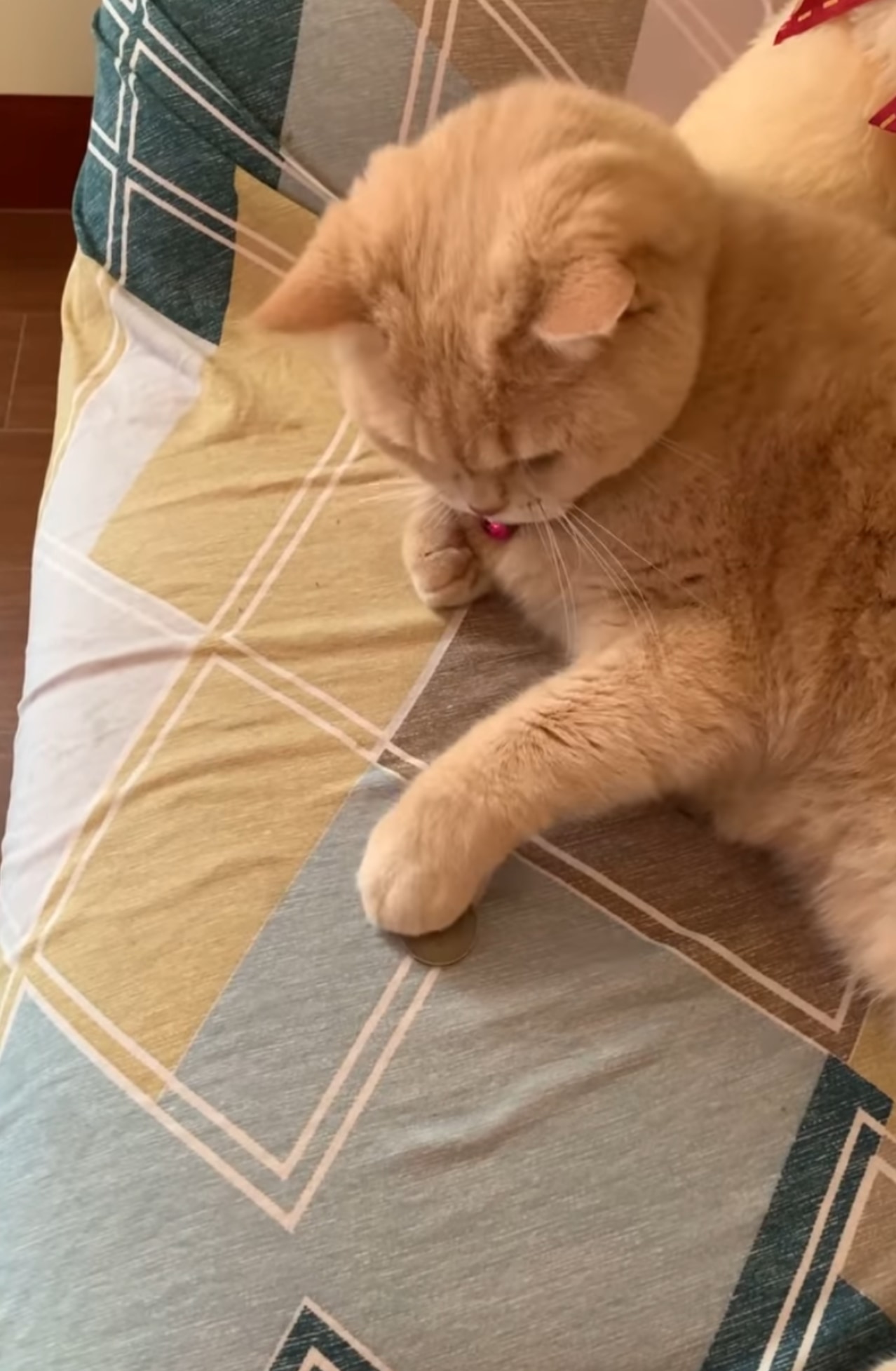 トリックを披露した飼い主さんは、今度はニャンコの手にコインを置きます。