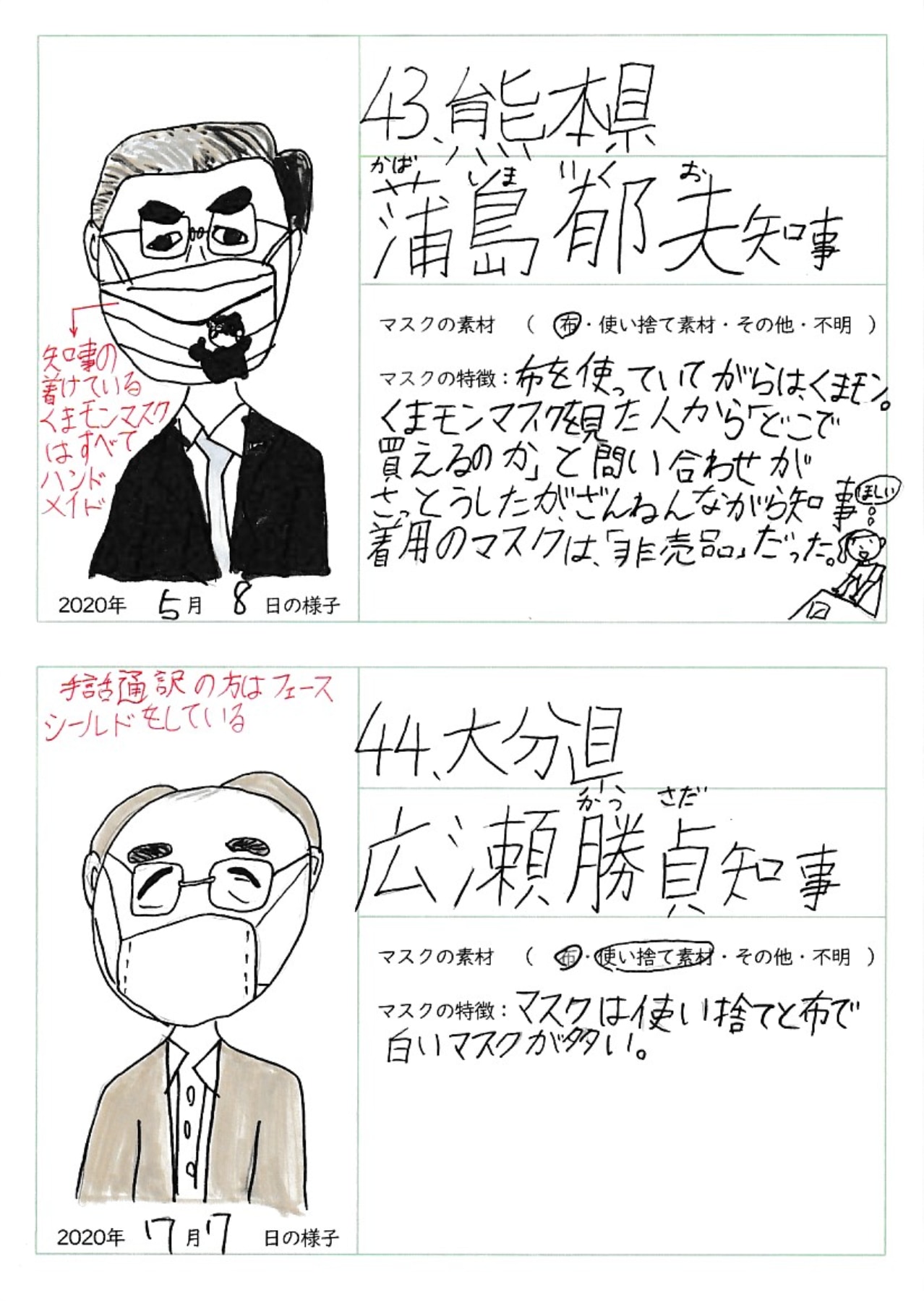 全知事の顔や名前を調べて似顔絵を描くだけでも大変な作業ですが、一人ひとりのマスクの特徴がしっかりと紹介されており、特産品やゆるキャラ、知事のちょっとした豆知識などがユーモアを交えながら書き添えられていて、娘さんが時間をかけて丁寧に、そして楽しみながら取り組んだことがよく分かります。