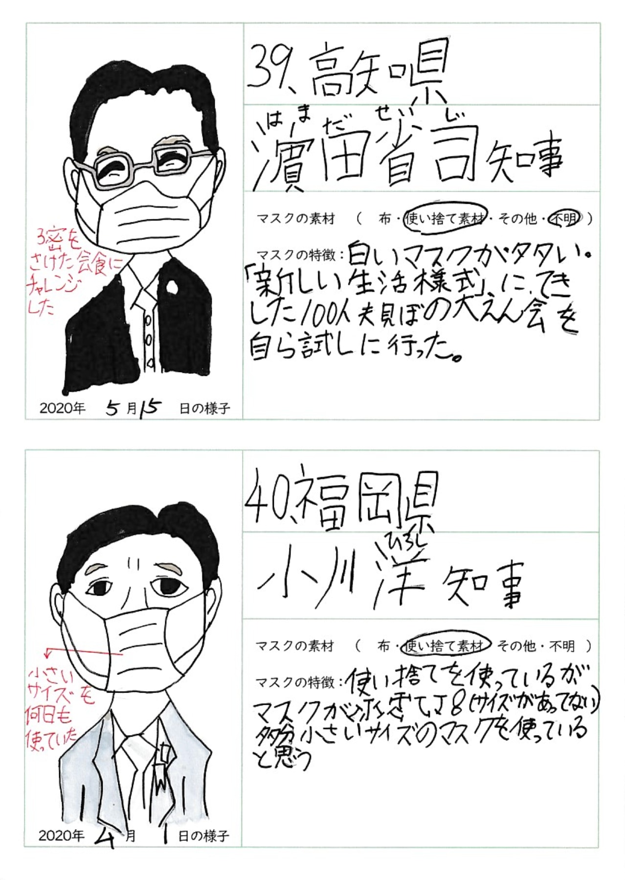 調査項目は、①都道府県名 ②知事の名前(本名)③マスクをしている顔 ④マスクの素材 ⑤マスクの特徴 ⑥画像の日付。これを47都道府県分行うとなると大仕事。