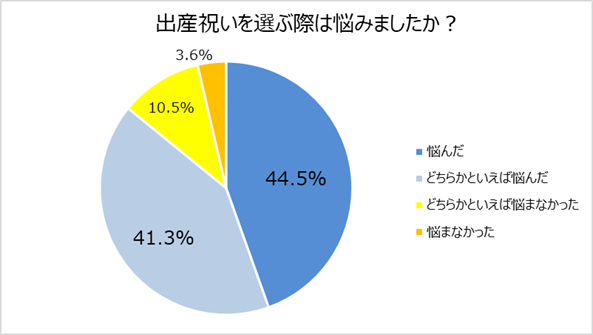 出産祝い選びの際に悩んだ経験の有無について聞いたところ、85.8%の人が「悩んだ」もしくは「どちらかというと悩んだ」と回答したという結果が出ました。