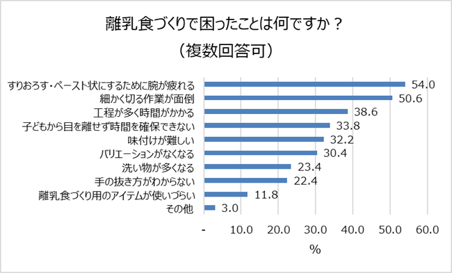 離乳食作りに困っている親が多く、中でも、「すりおろす・ペースト状にするために腕が疲れる(54.0%)」「細かく切る作業が面倒(50.6%)」といった作業に困っているという調査結果が出ました。