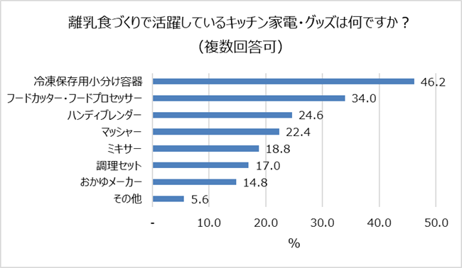「冷凍保存用小分け容器(46.2%)」、「フードカッター・フードプロセッサー(34.0%)」などを使用しているご家庭が多く、便利グッズも欠かせません。