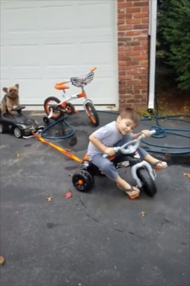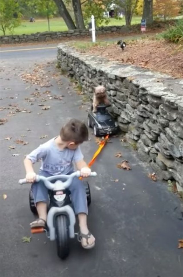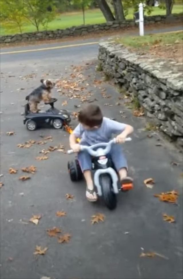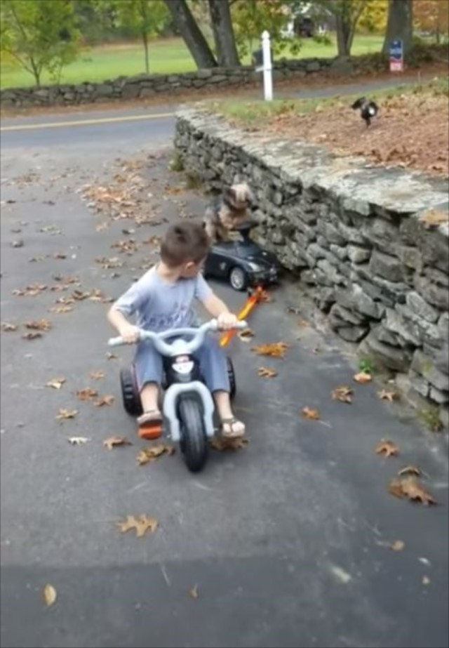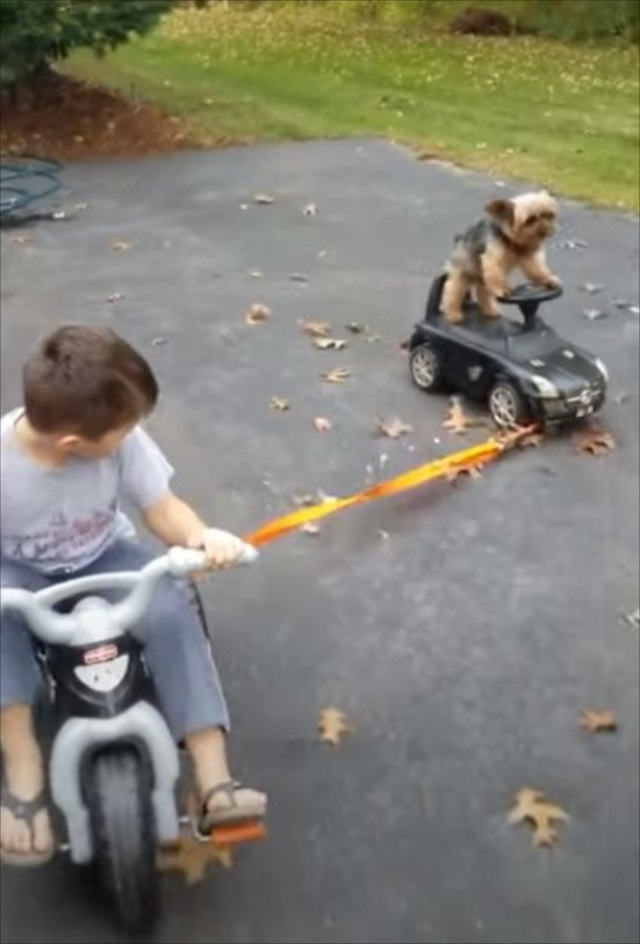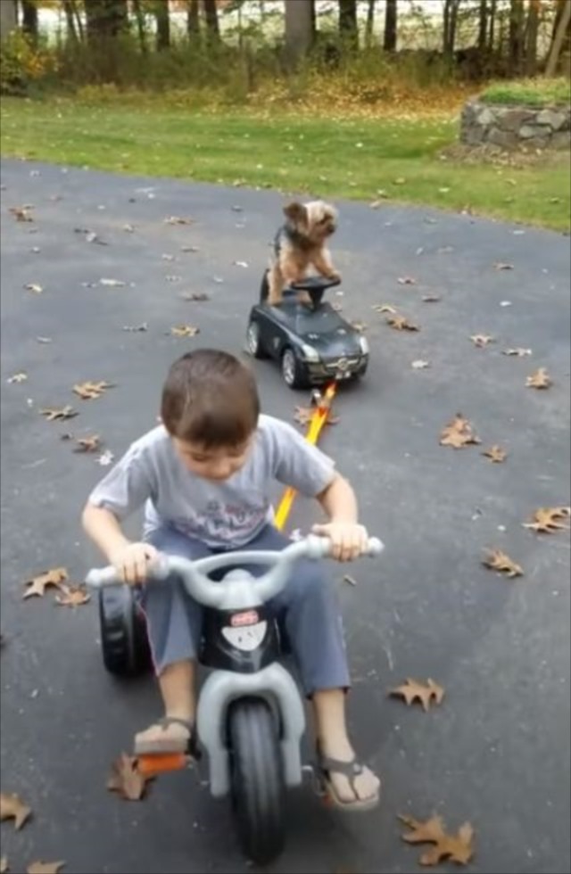 出典:YouTube(Yorkie gracefully rides toy car while towed by kid on bike)