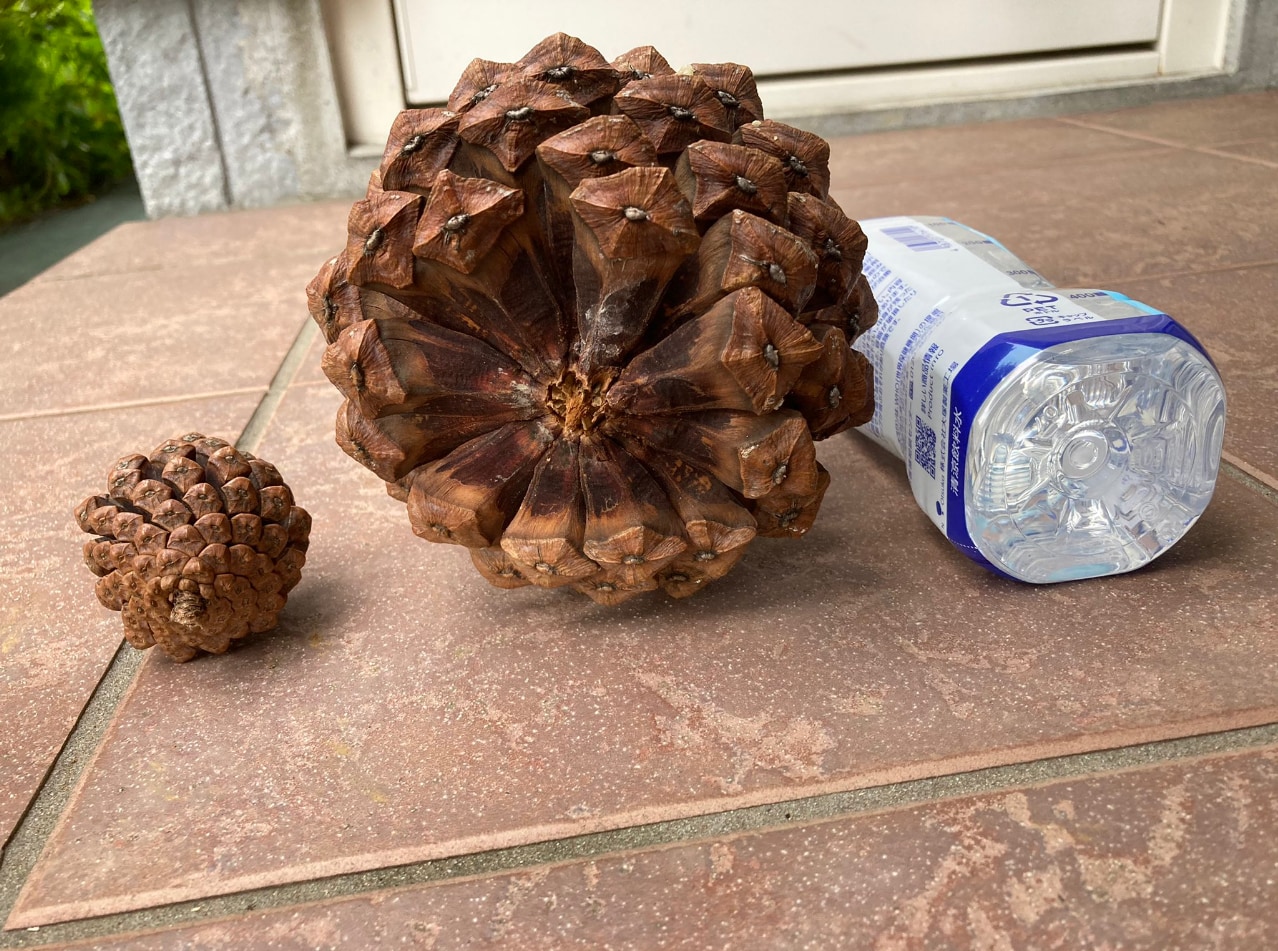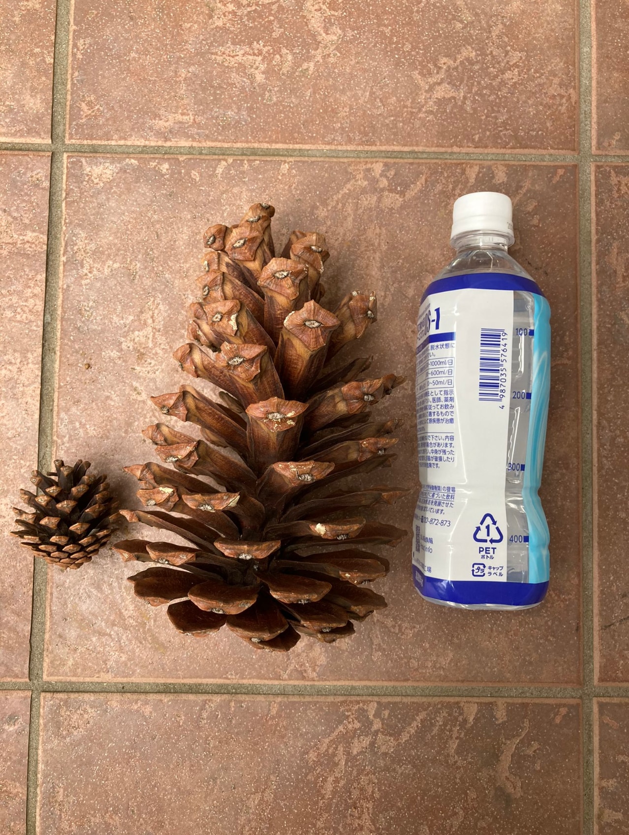 大きさが分かるように、普通サイズの松ぼっくりと500mlペットボトルを並べて比較した写真が公開されています。