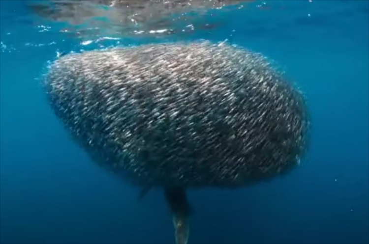これはベイト・ボールと呼ばれる魚類がつくる球形群。