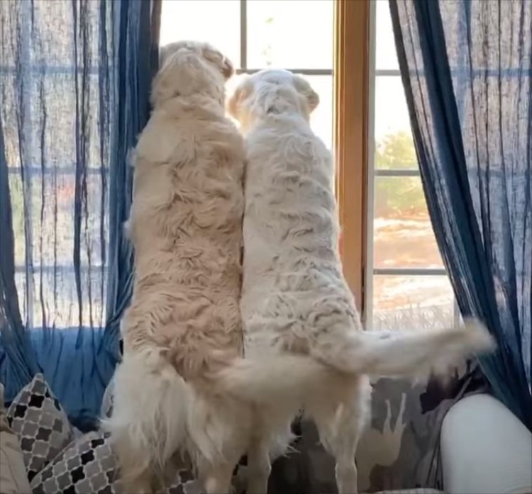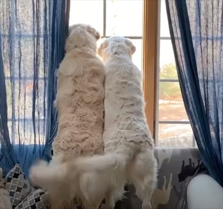 お兄さんが仕事から戻って来ると、窓の外を仲良く並んで眺めながら、尻尾を振っています!