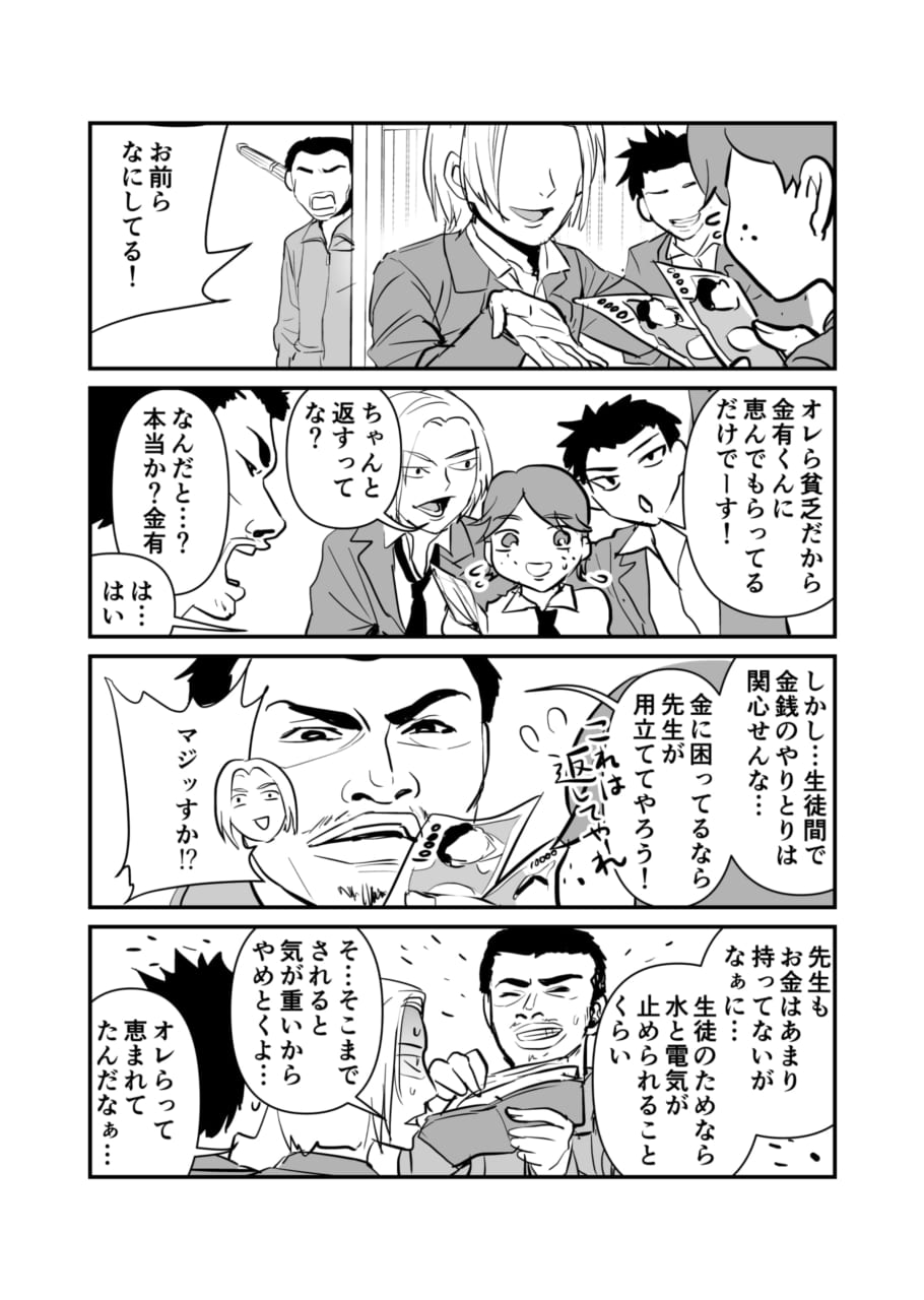 こちらでは、1人の生徒に金を無心するヤンキー生徒を鬼センが注意している様子が描かれています。