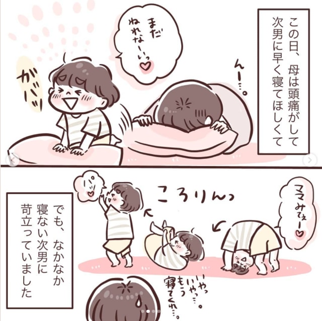 そんな、なかなか寝てくれない次男くんに、体調がすぐれていない事もあってかmiho(@miho.haha)さんは少し苛立ってしまい先に寝ようとします。