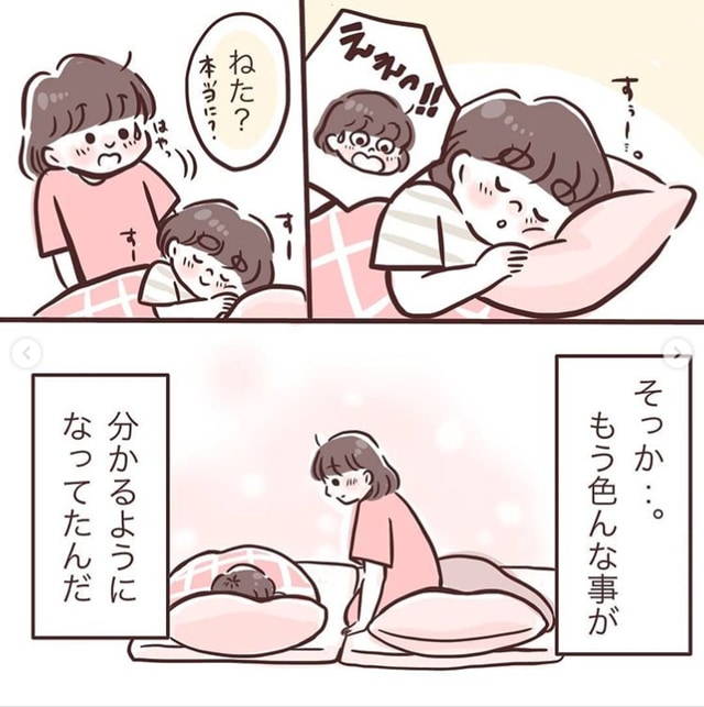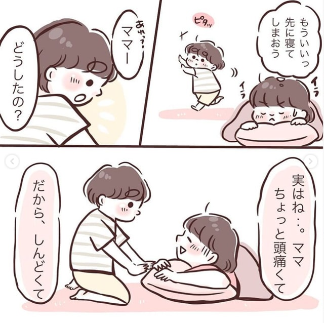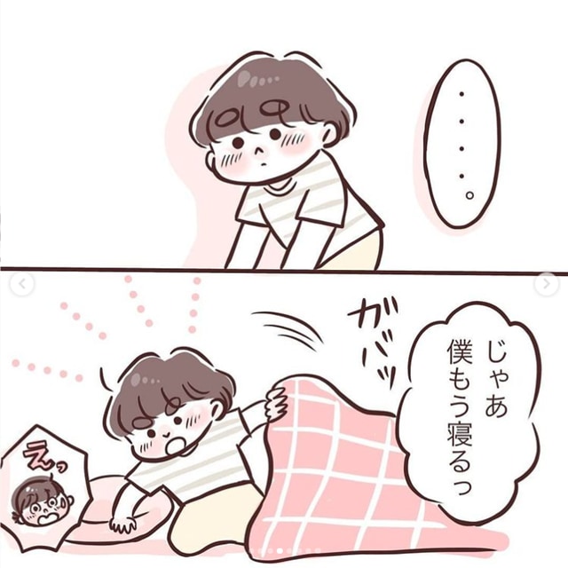 miho(@miho.haha)さんが体調が優れないことを伝えると、次男くんは「じゃあ僕もう寝る!」と一人で布団に。