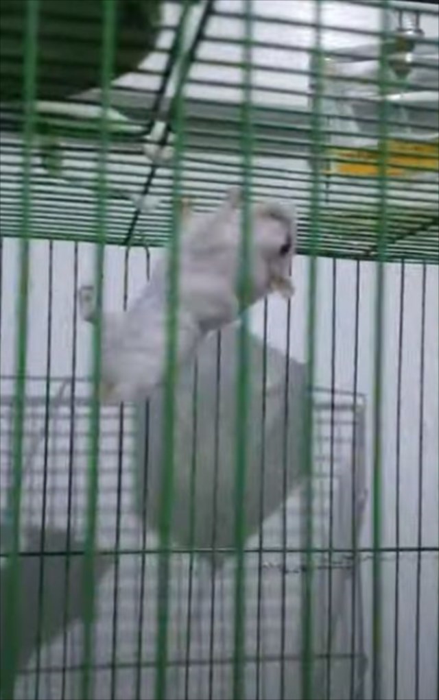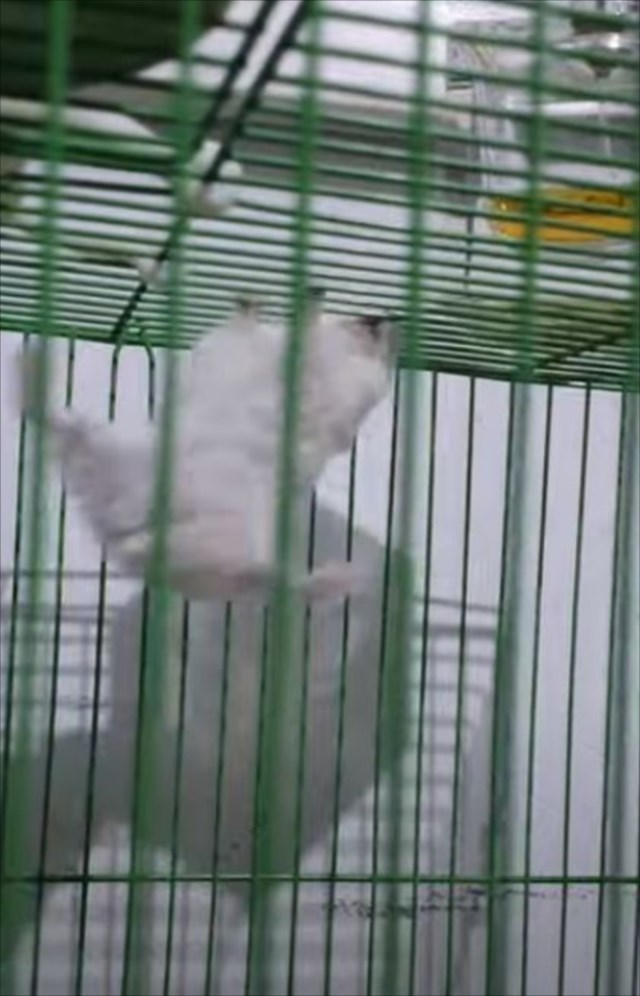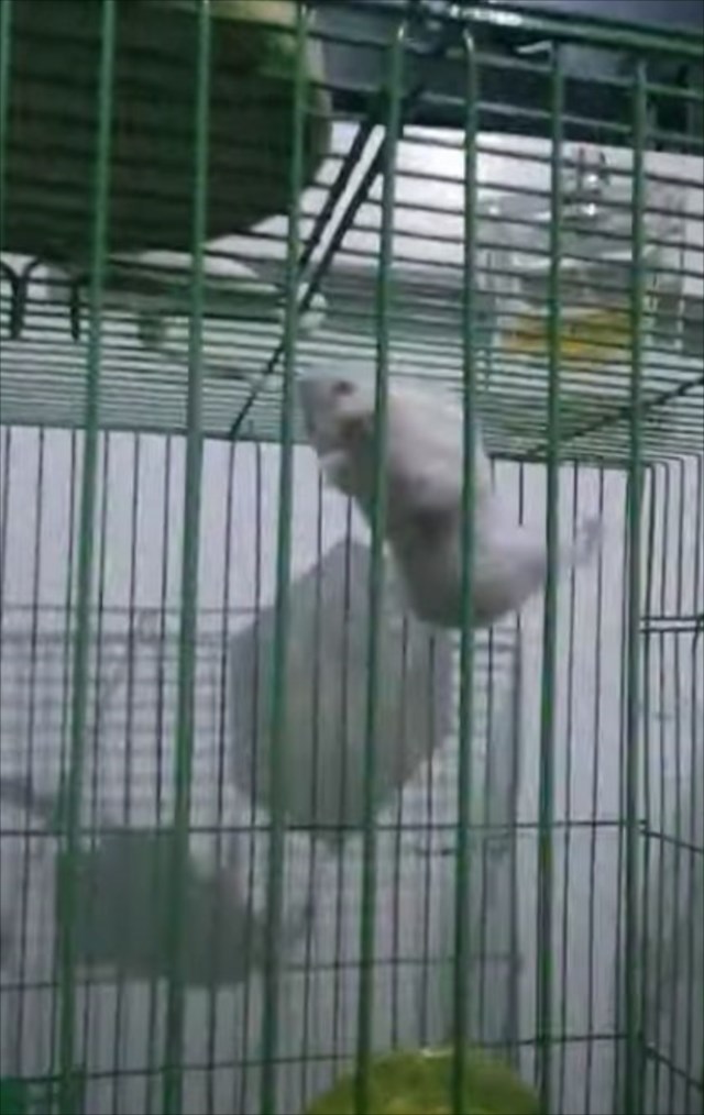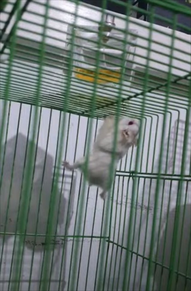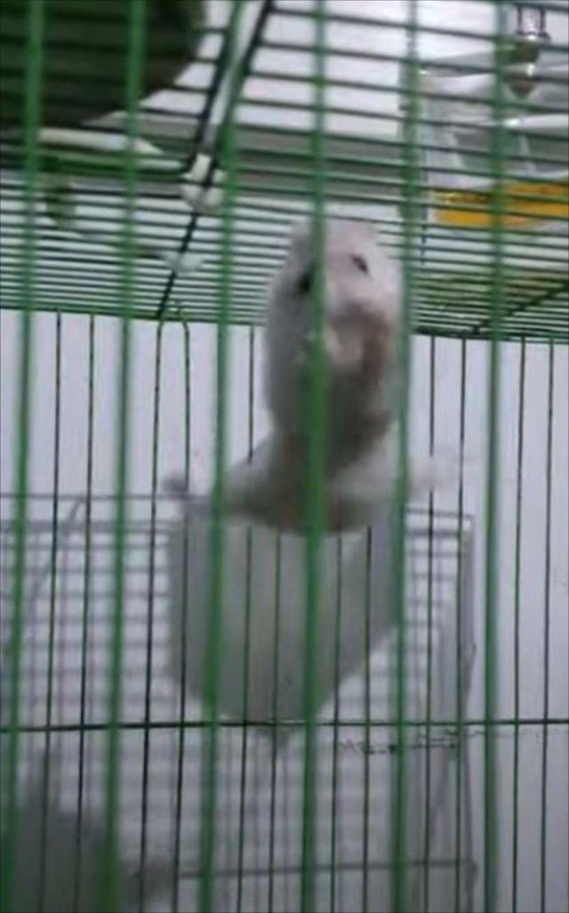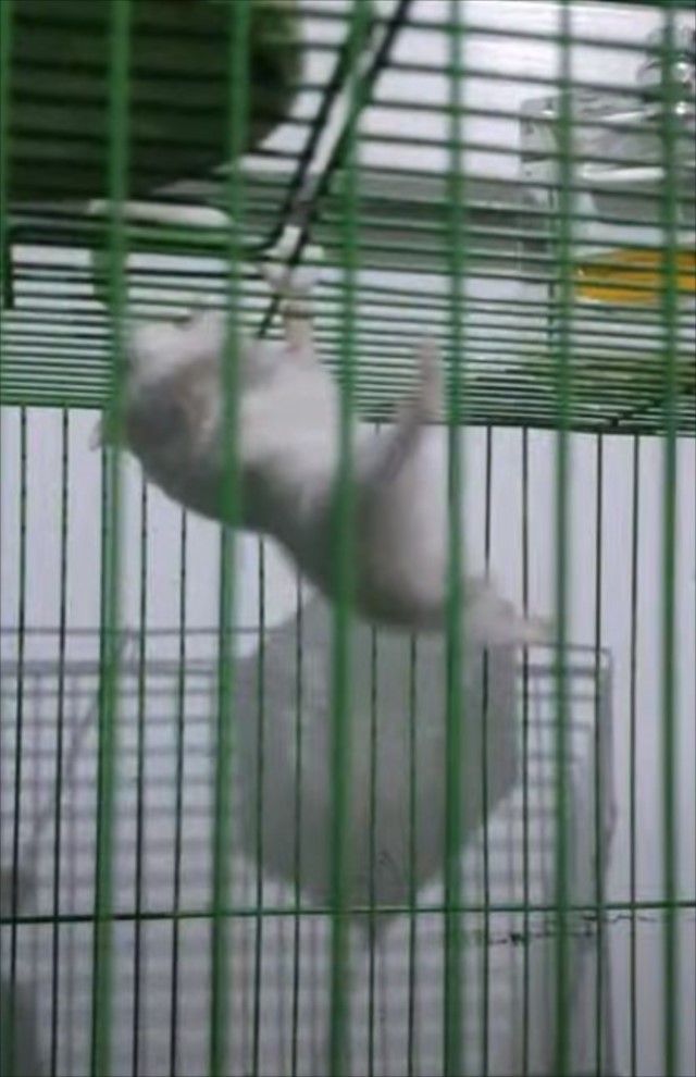 ゲージの天井に後ろ足はぶらぶらさせたまま、しがみついています。