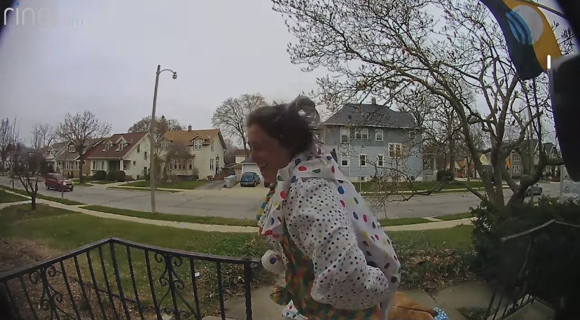 ピエロのようなコスチューム姿でやって来たご近所さん。