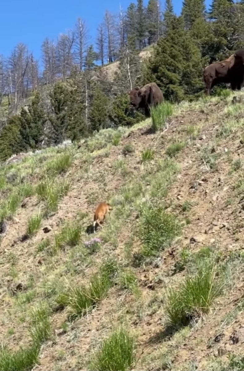 なぜなら、2頭を追ってバイソンの赤ちゃんが懸命に坂を登っているのです。