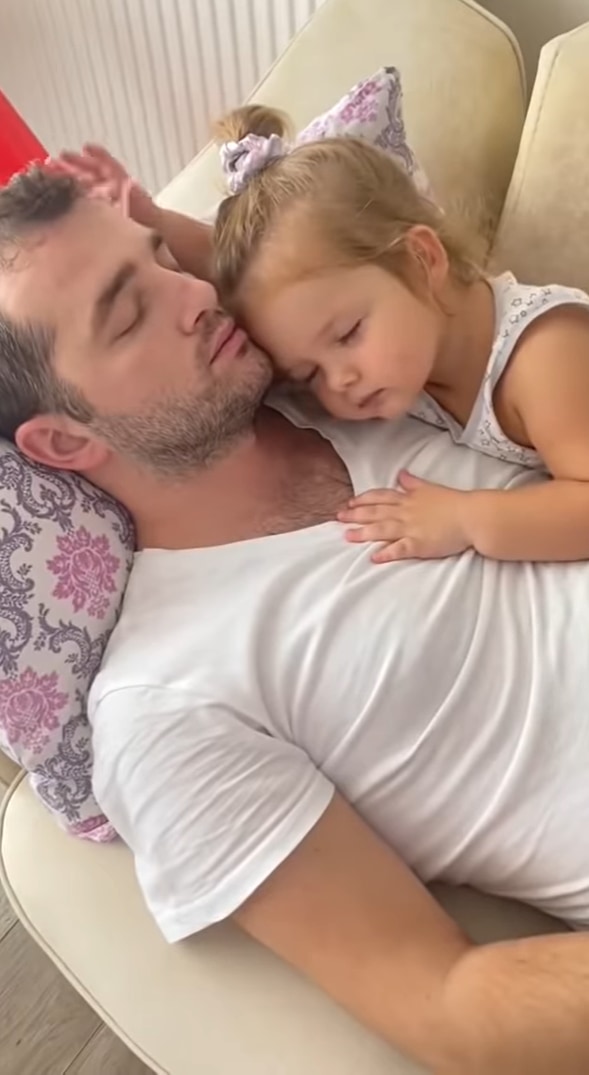 このお宅の娘ちゃんが、パパと仲良くお昼寝タイムのようです。