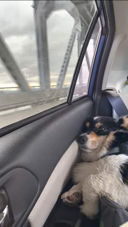 「お家帰りたくない」ビーチでたくさん遊んだ犬は、帰りの車の中で虚脱感しかない姿をしていました