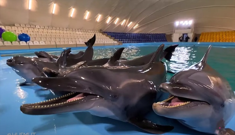 ウクライナ・カルフコフ出身のマイクさんは、シベリアンハスキーの「ロッキー」を連れて、イルカがいる水族館にやってきました。