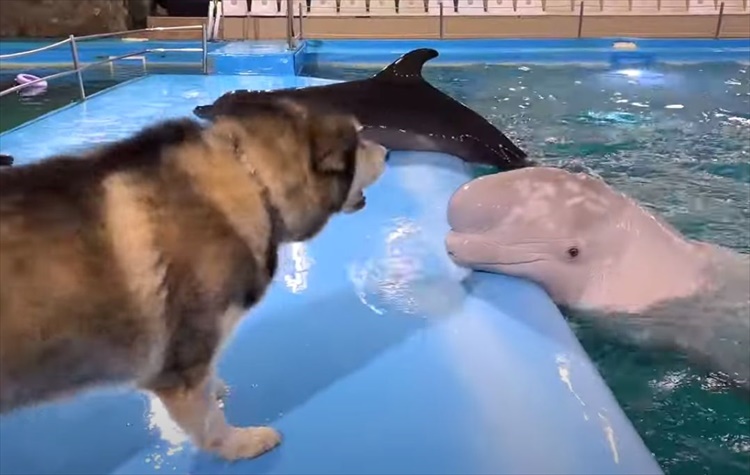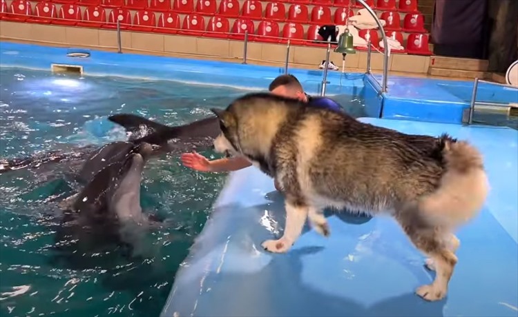 初めて出会ったイルカたちに、警戒心を抱いていたハスキー犬。