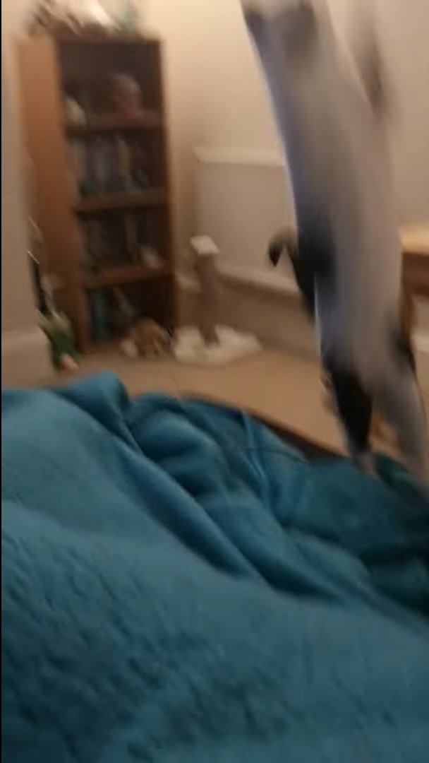 飼い主さんが放ったオモチャを空中キャッチすべく大きくジャンプしたミア。