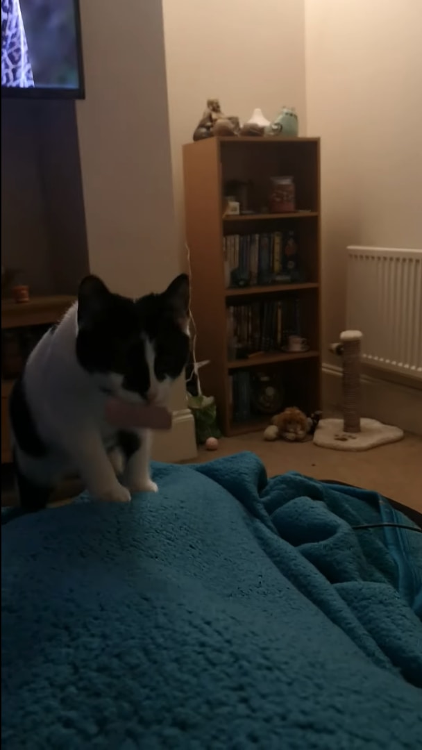 子猫のミアが、空中キャッチすべくオモチャを飼い主さんに放ってもらって遊んでいる姿はこちらの動画からご覧いただけます。