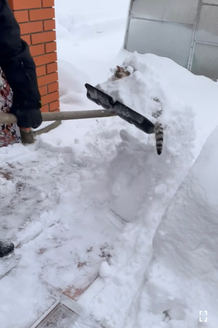雪かき作業をする飼い主さんに、雪と一緒に自分もスコップですくってもらいたがる猫の「ベリヤーシュ」。