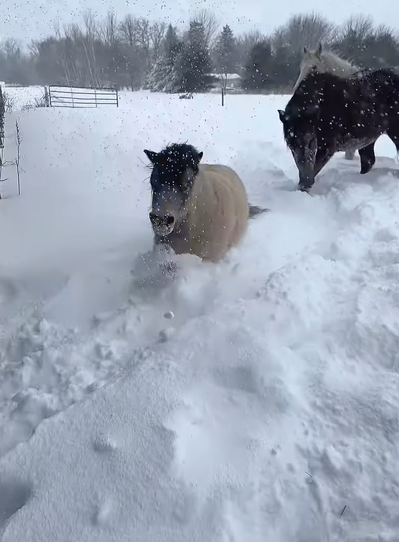 雪に体が半分埋まっていても元気に駆けるミニチュアホースの「パイロット」、その姿はこちらの動画からご覧いただけます。