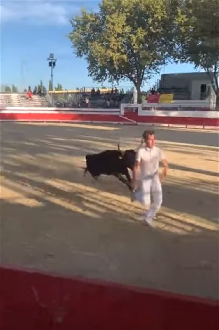 低いフェンスを乗り越え、闘牛士を追いかけます。