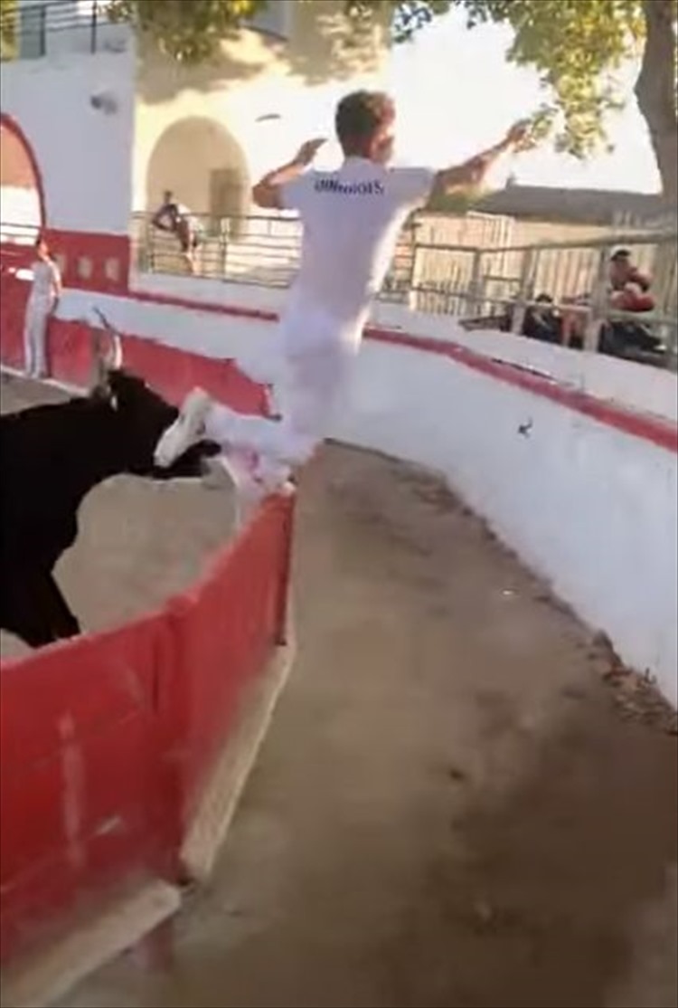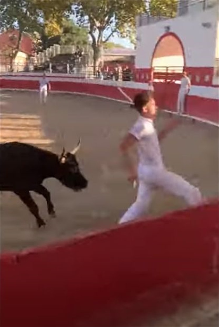 闘牛士が、闘牛に凄まじい勢いで追われている!これは万事休すか・・・と思われましたが、間一髪でフェンスを跳び越えて逃げ切りに成功しました!