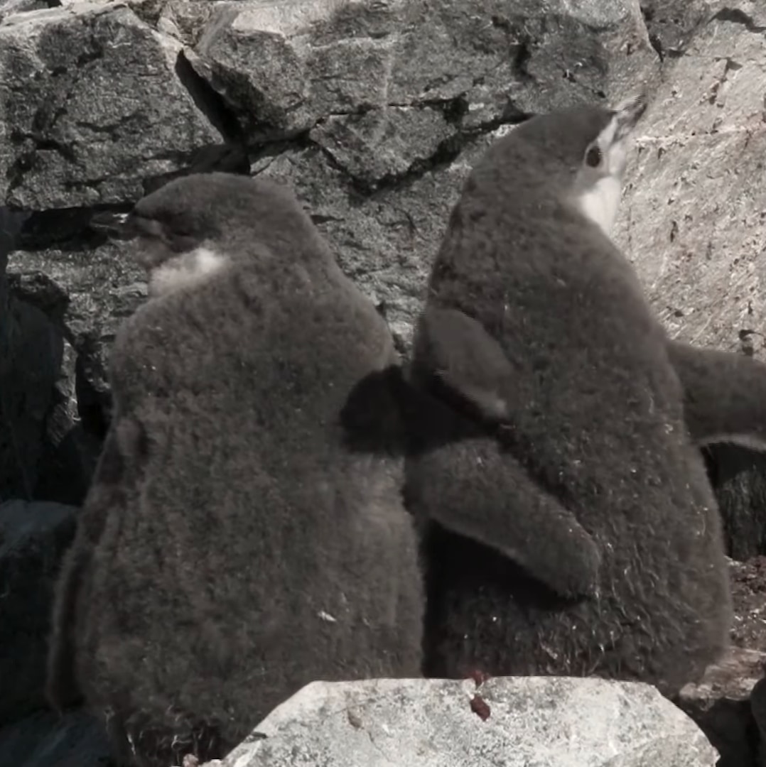 南極大陸のオーン港で遭遇したう2羽のヒゲペンギンのヒナの姿を捉えました。