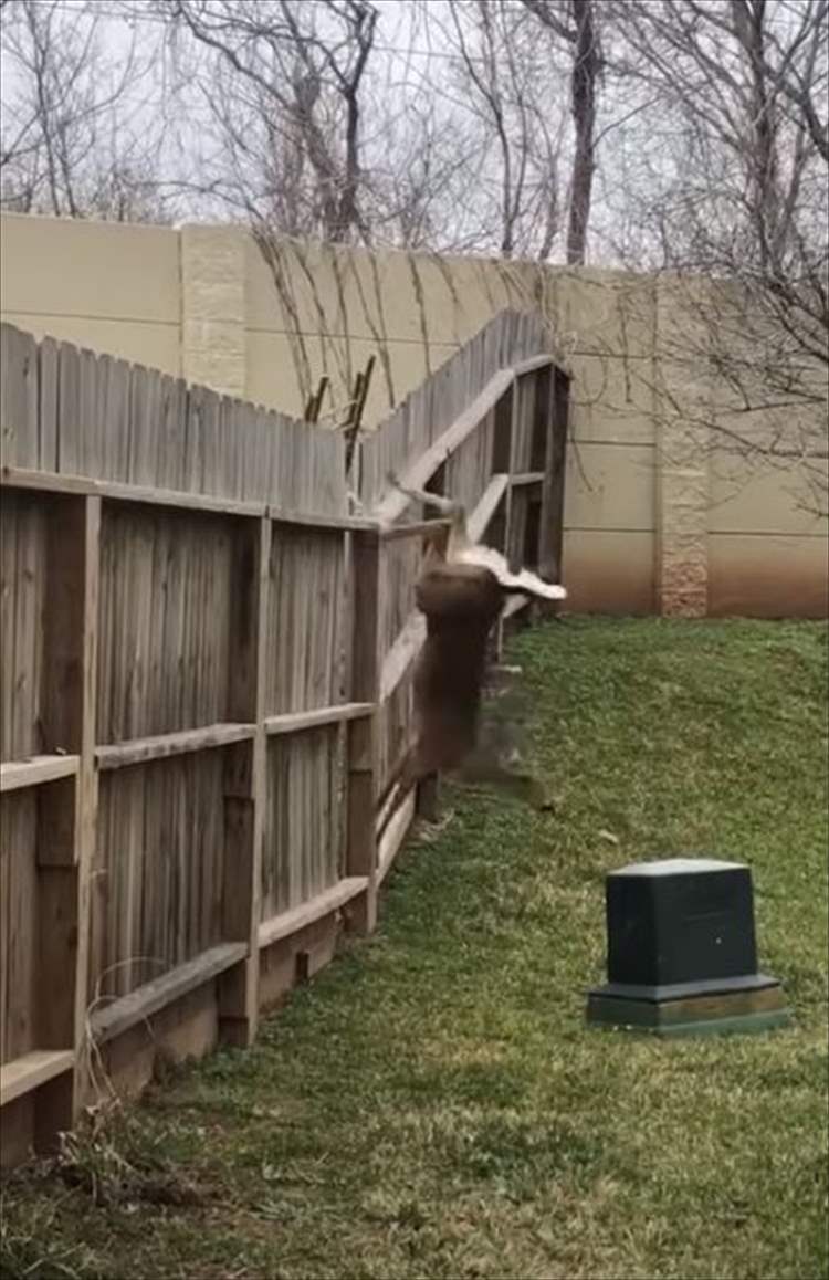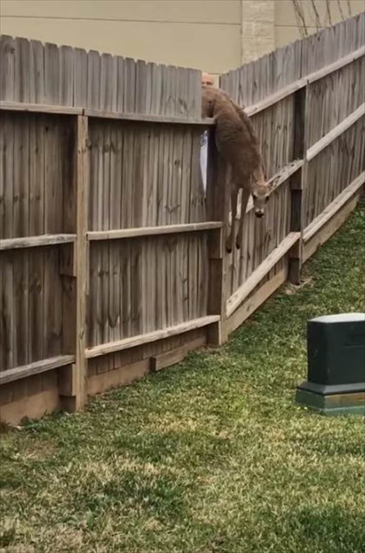 裏庭に設けられたフェンスの、2m近い高さの場所で引っかかっていたシカ。