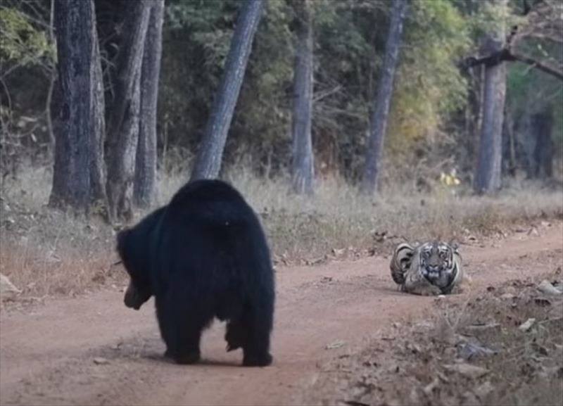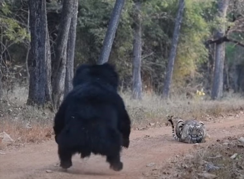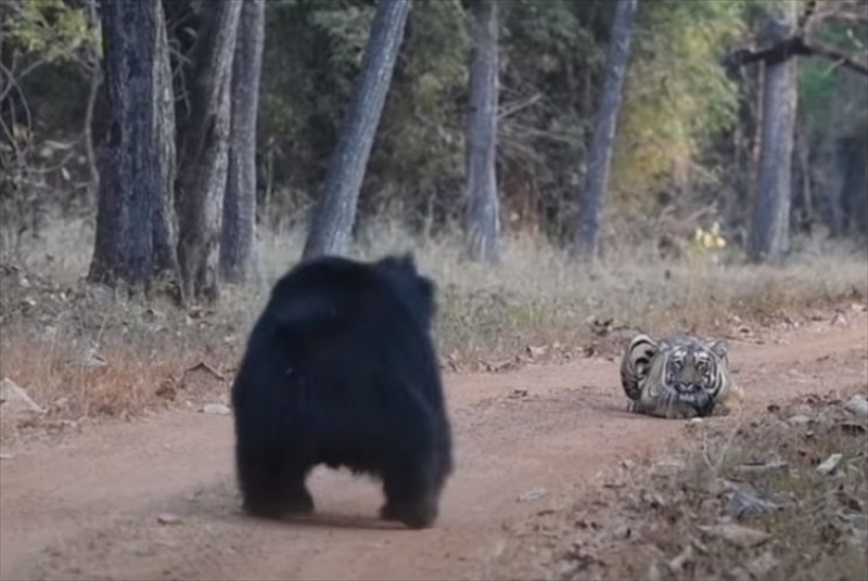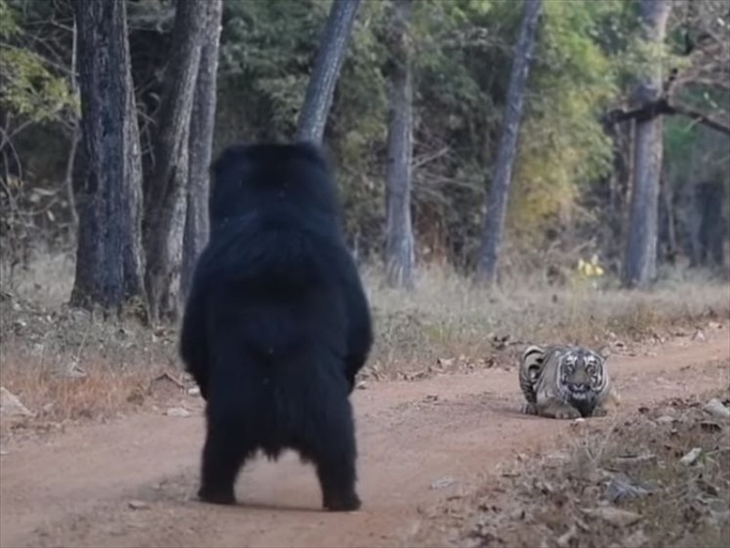 ジャングルの中で遭遇した、トラとナマケグマが対峙する様子は、こちらの動画からご覧いただけます。