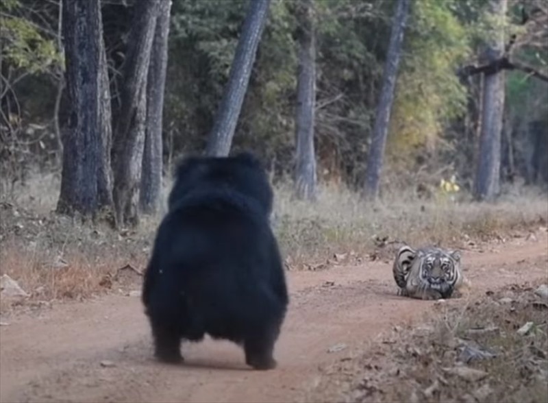 クマとトラが対峙するという、緊迫の瞬間をとらえた動画。