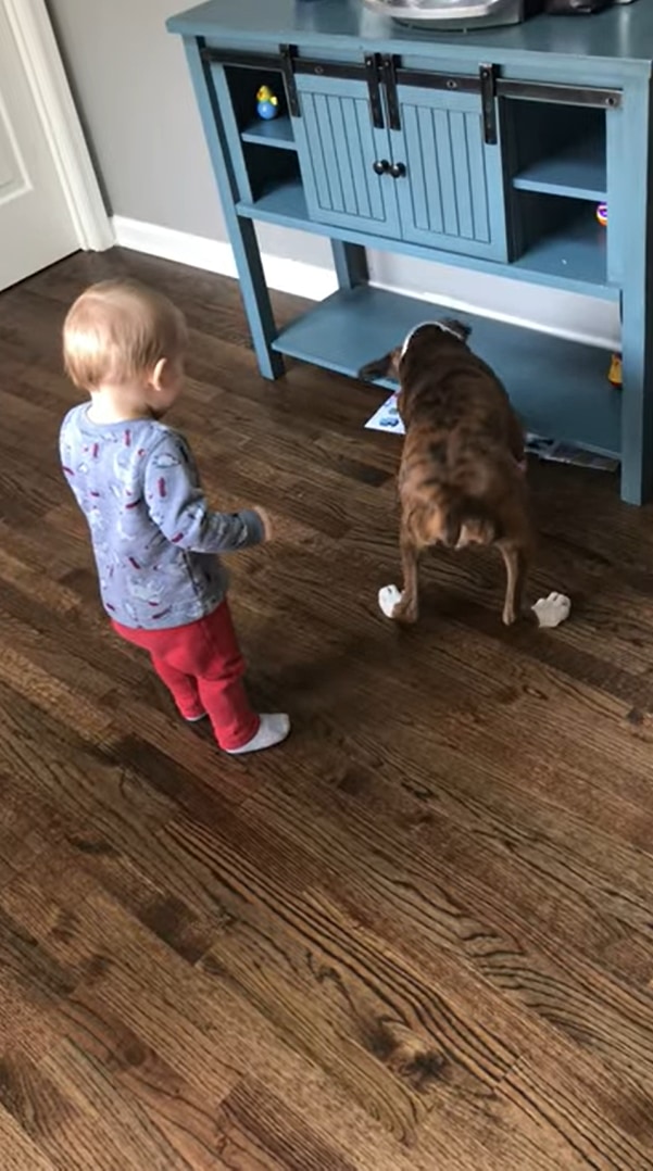 今回ご紹介する動画でも、赤ちゃんと生後半年のボクサー犬が一緒に過ごしている様子が捉えられているのですが・・・、その姿は奪い合いをしているようにも見えるものでした。
