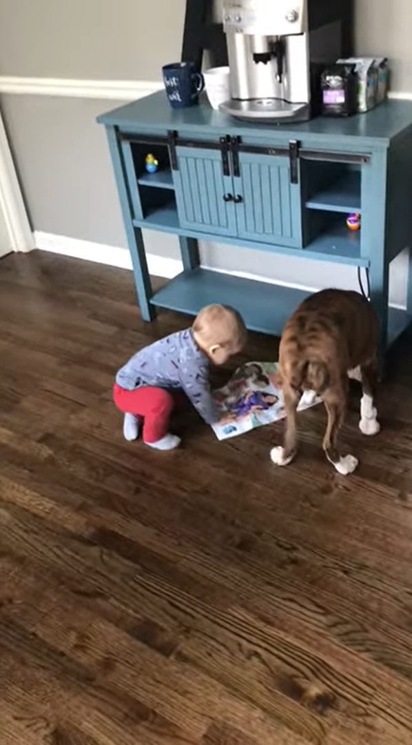 頑張って取ったチラシを赤ちゃんに譲ってあげたのか、後ろに下がるボクサー犬。