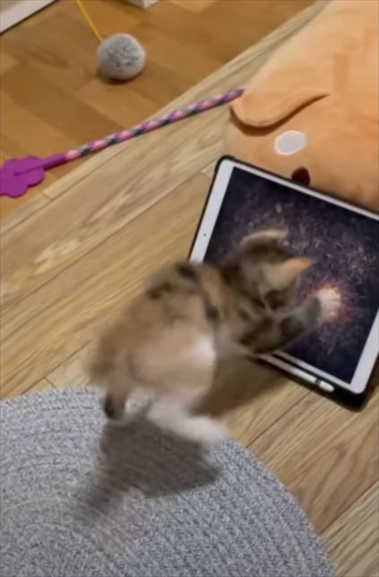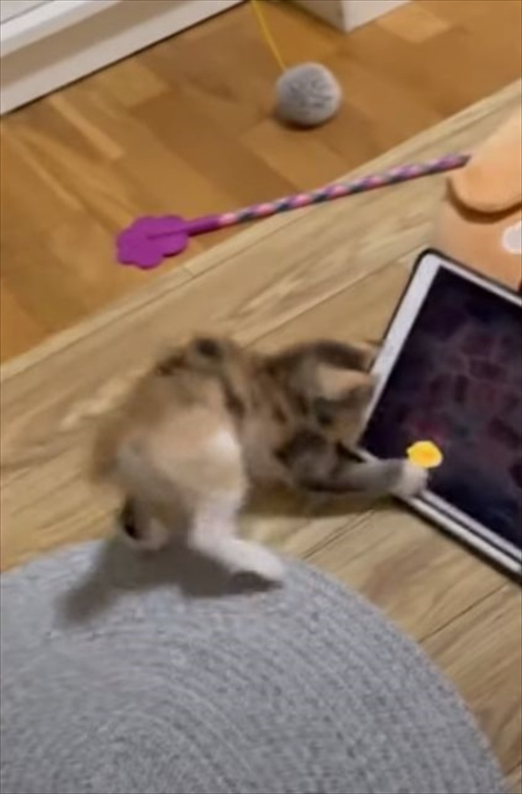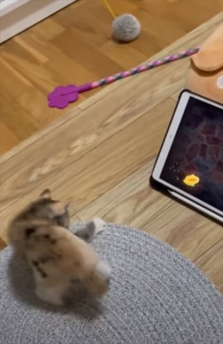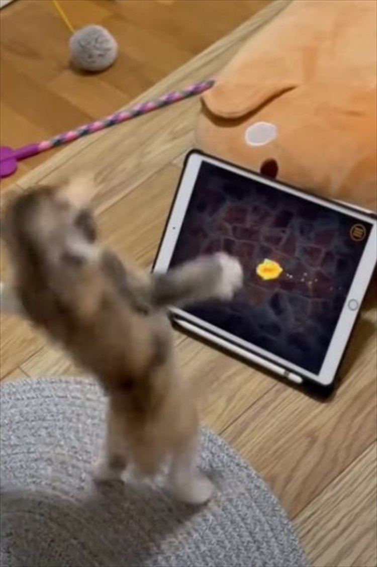 ゲームに夢中になって必死になっている姿がかわいい子猫の姿を捉えた動画でした。