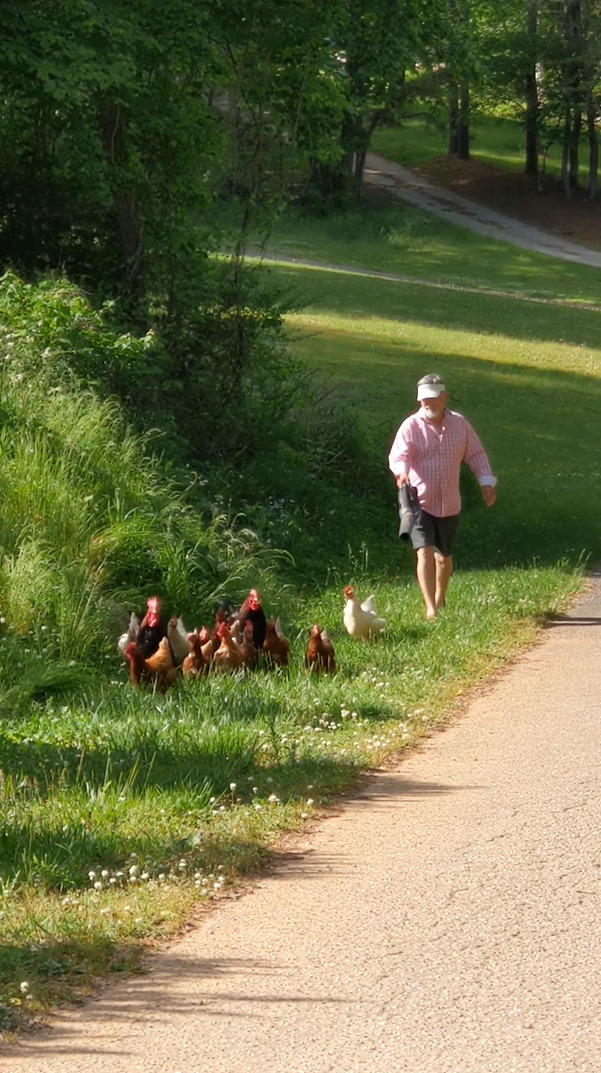 意外な道具ながら、安心かつ安全な方法でニワトリたちを鶏舎まで連れて帰るお父さんなのでした。