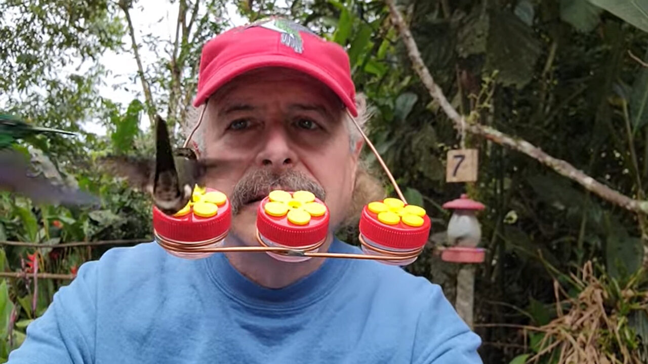 場面は変わりますが、次のシーンでも男性はもちろん自作のハチドリ用の餌箱を備えたアイテムを装着しています。