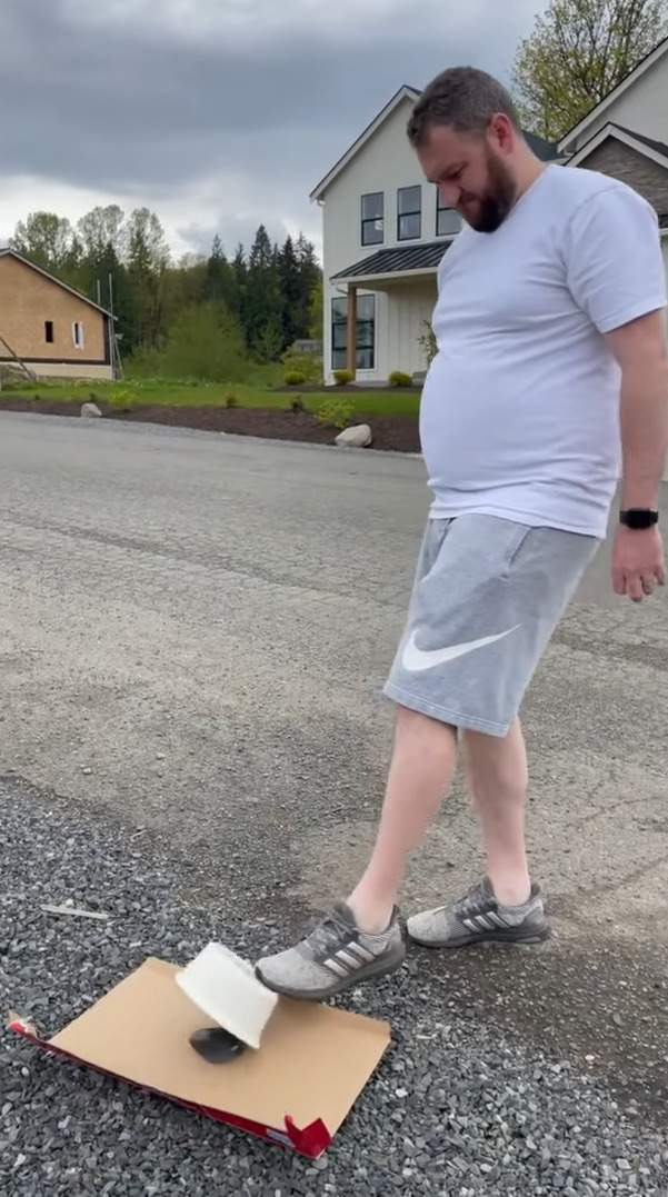 どうにか、ボウルの下にダンボールを滑り込ませるのに成功した旦那さん。