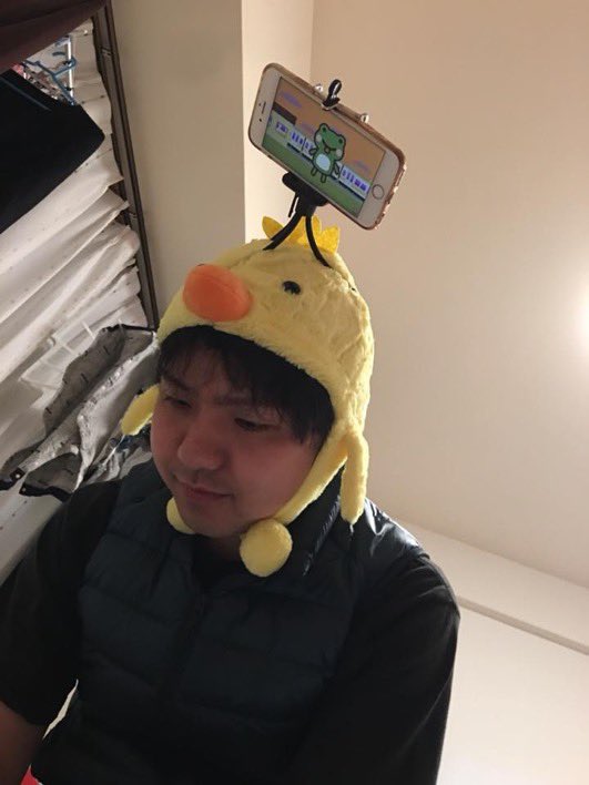頭にかぶっているのは、ダイソーで購入されたという被り物。さらにスマホ用の三脚も取付けています。