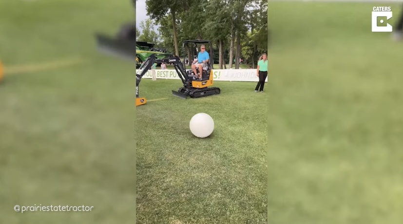 男性は重機の先をゆっくりスイングさせると、巨大なゴルフボールを確実にとらえました!!