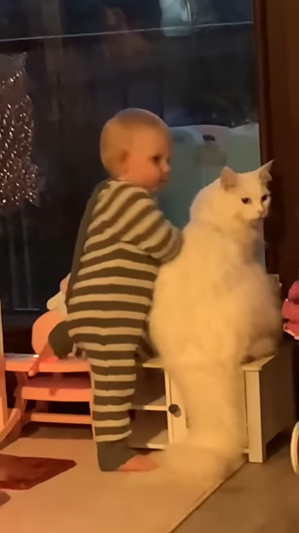 赤ちゃんが猫のことをぎゅっと抱きしめたりして過ごしていたところ、猫が手押し車に乗り込みました。