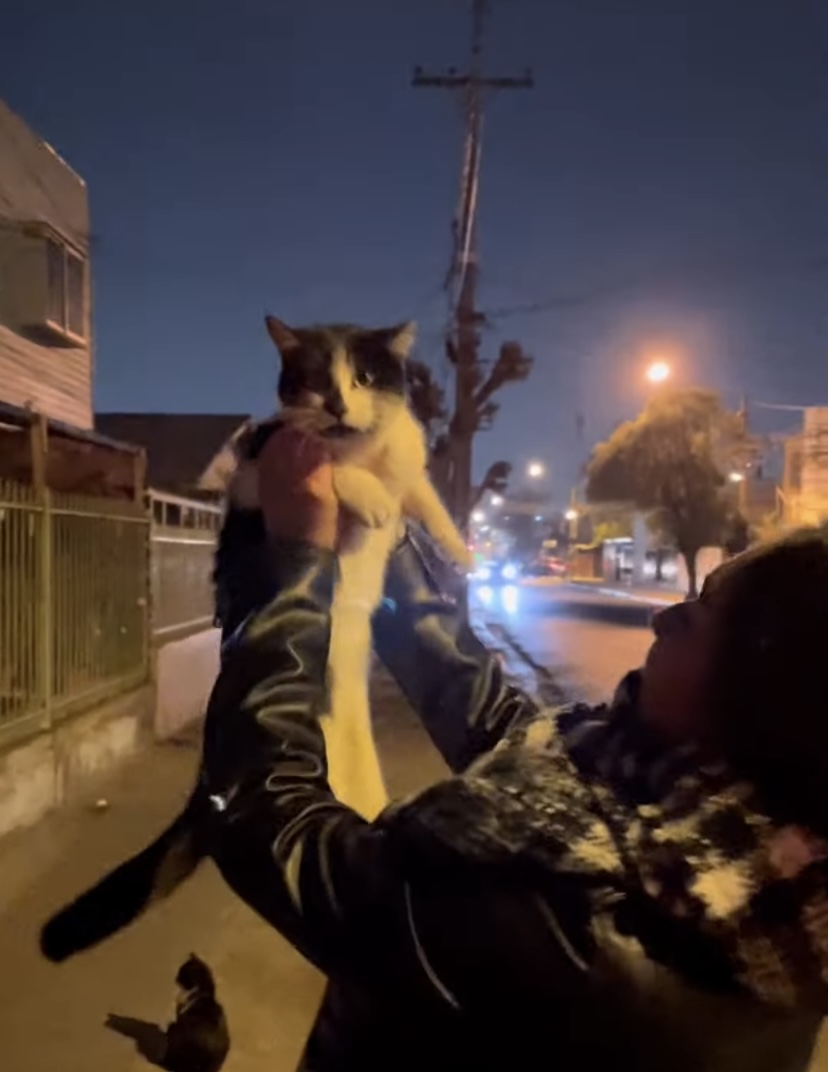 女性は赤ちゃんを抱き上げるかのように、野良猫のことを愛おしそうに抱き上げるのでした。