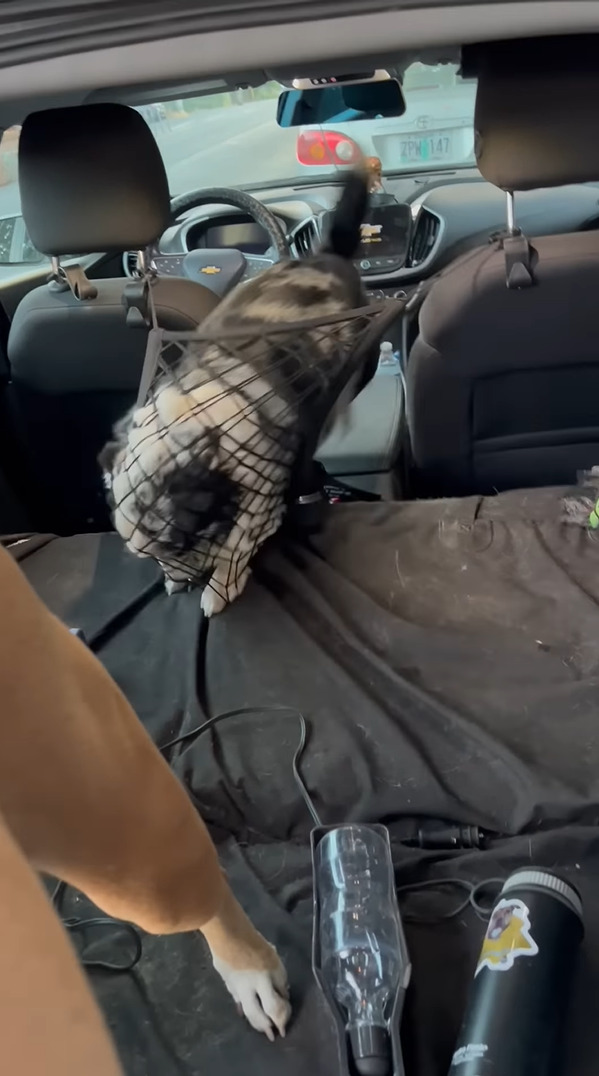 先程の失敗を踏まえてか、運転席にネットを結びつけるための隙間に頭を通すと・・・
