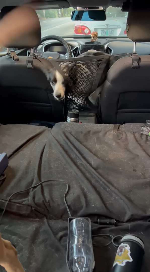 車の運転席と助手席の間に張られているネットに正面衝突してしまったコーギー。