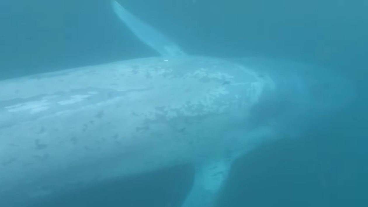 海中に潜っていってしまったシロナガスクジラの姿を追うため、カメラを海中に潜らせれば、そこにはカメラに収まりきらないほどの巨体が映っていました。