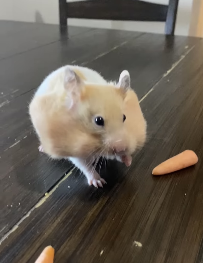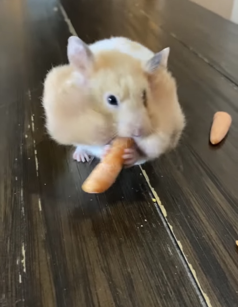 朝ご飯の時間ということで、飼い主さんはハマンサにベビーキャロットを差し出しました。