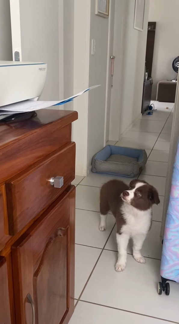 プリンターが動いているのを初めて見るというボーダーコリーの赤ちゃん。