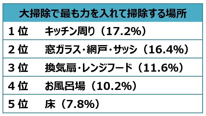 力を入れて大掃除する場所に関する質問で最も多かったのは、シンクやガス台等の「キッチン周り」が17.2%、