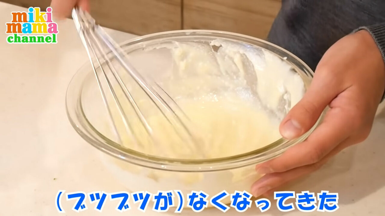 クリームチーズを混ぜて、砂糖、牛乳を加えてなめらかになるまで混ぜます。