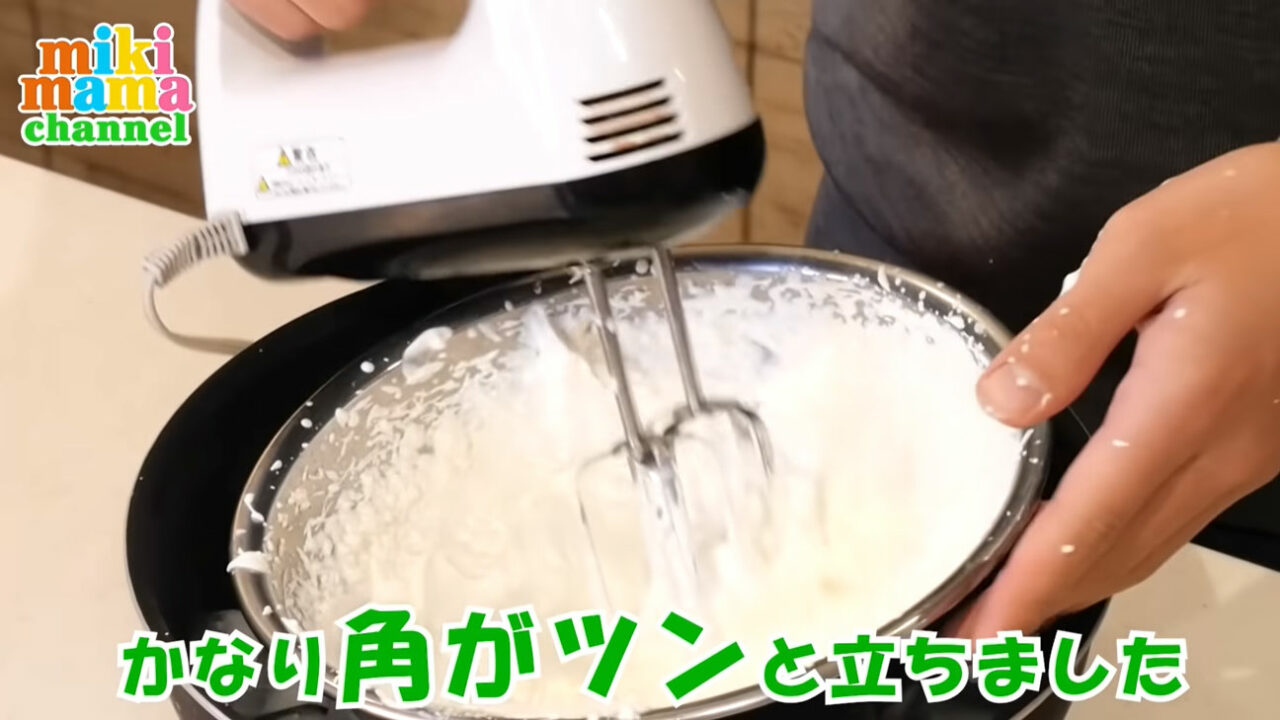 次は生クリームを泡立てます。ツノが立つようにしっかりと泡立てます。