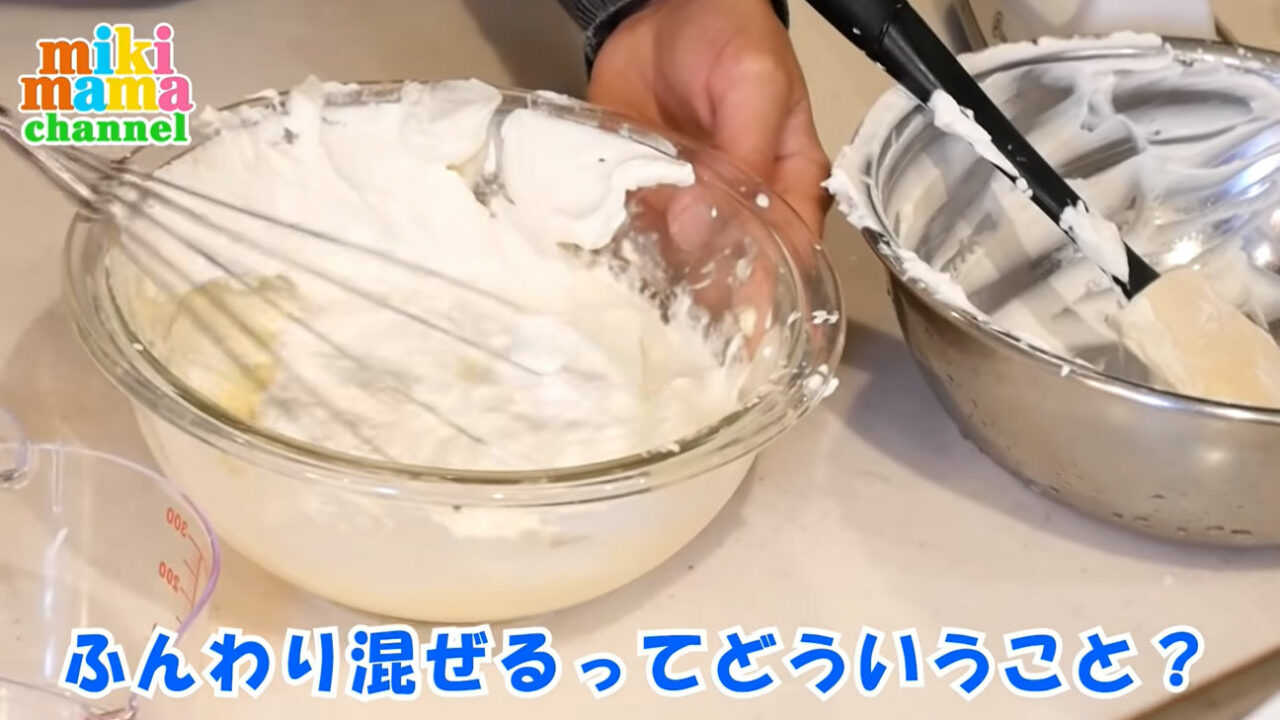 泡立てた生クリームをクリームチーズの方のボウルに移して、ふんわりするように混ぜます。
